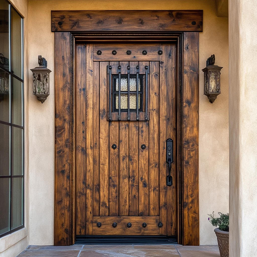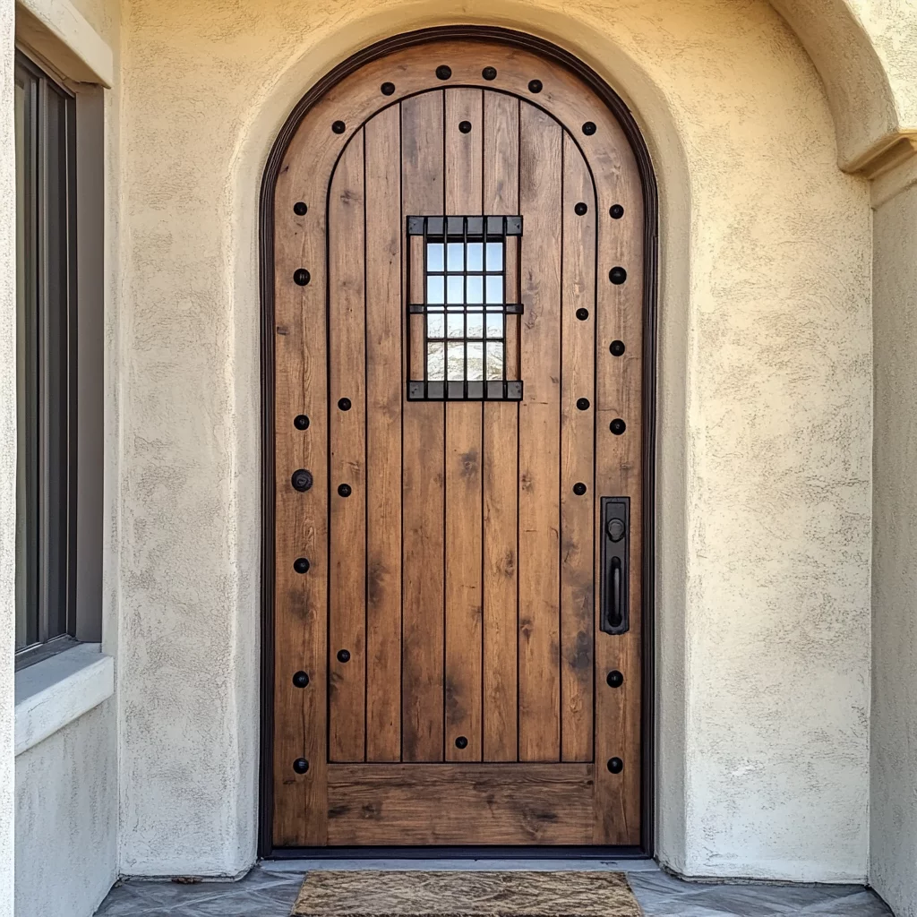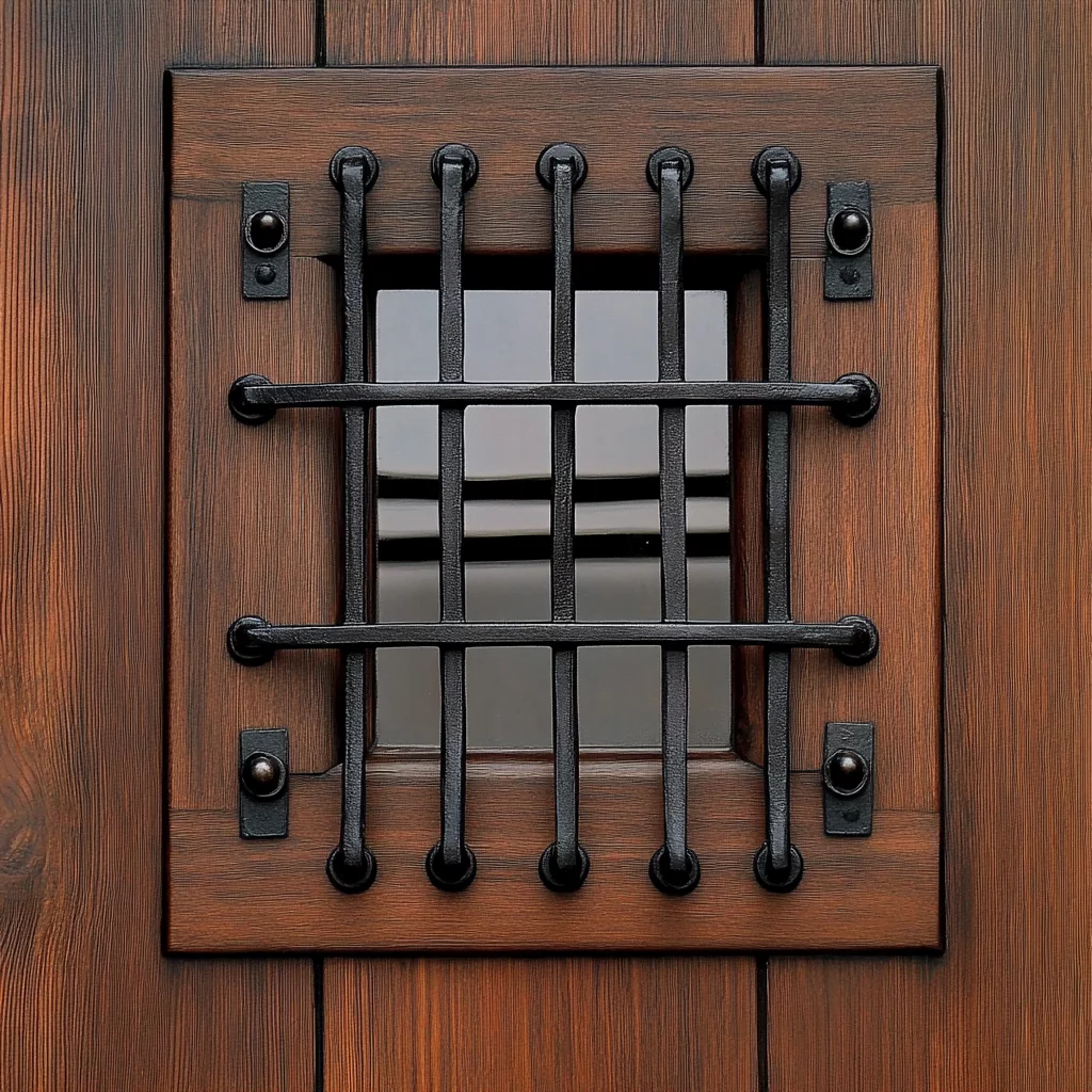A solid wood or metal door featuring a small hinged iron grille or peephole, allowing you to see and communicate with visitors securely. Inspired by Prohibition-era bars, these doors offer a unique blend of charm and security.