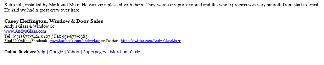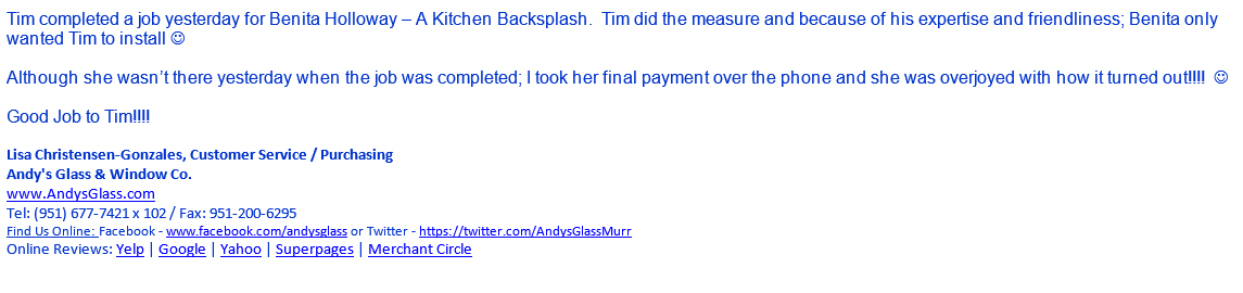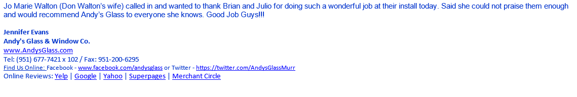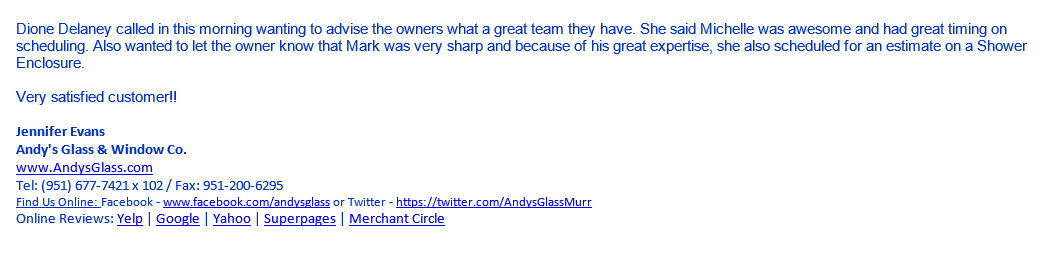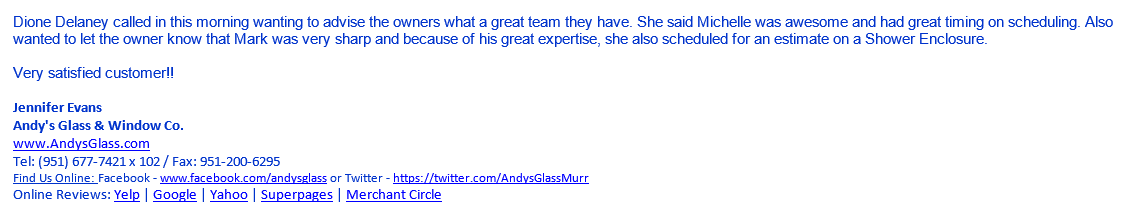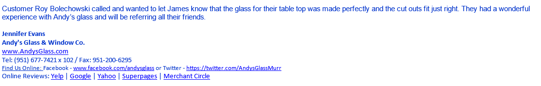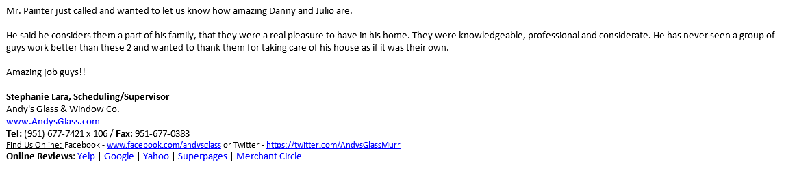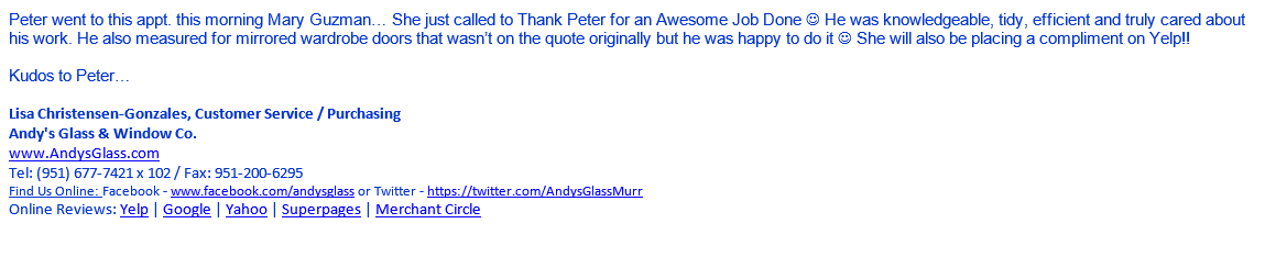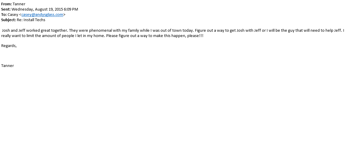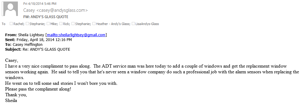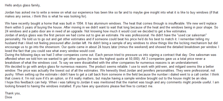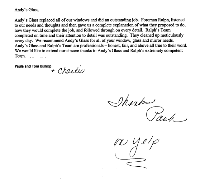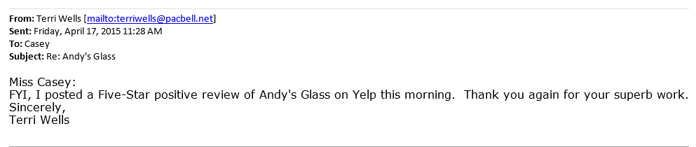 "Dear Mike, I just want to write you and say how pleased I am with Andy's Glass. The customer service you brought to my door goes far beyond normal. Top notch from talking to you on the phone and the installer who made the repairs (sorry I forgot his name). You now have a customer for life (or as long as you own Andy's Glass.) I will no longer need a phone book when I need anything with glass. If anybody asks me for recommendations, Andy's Glass is all I'll speak of. Thank you again for making this repair smooth & hassle free. I'll never forget Andy's Glass."