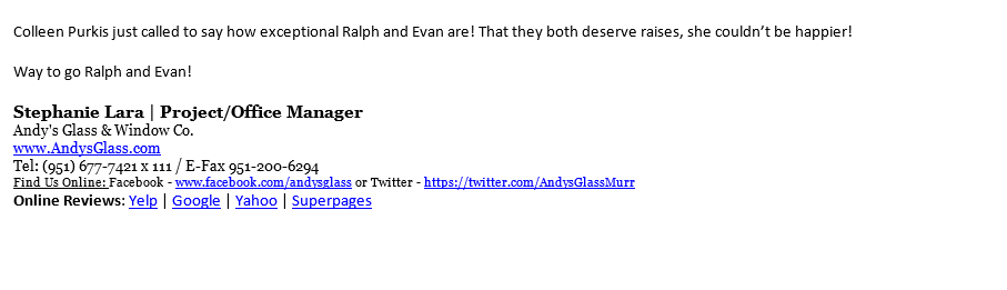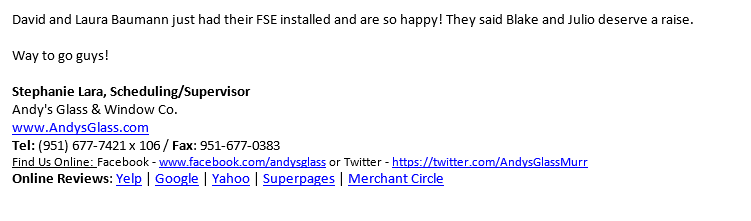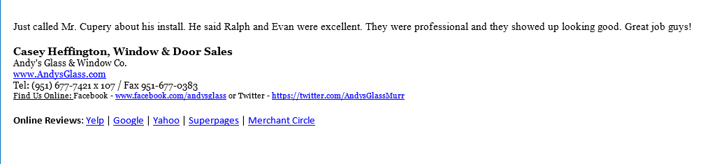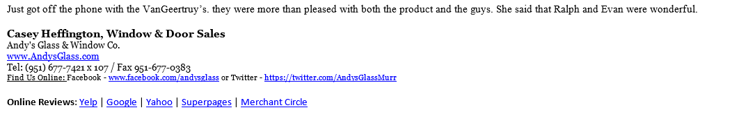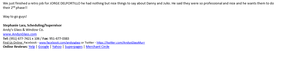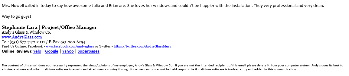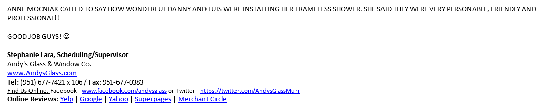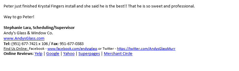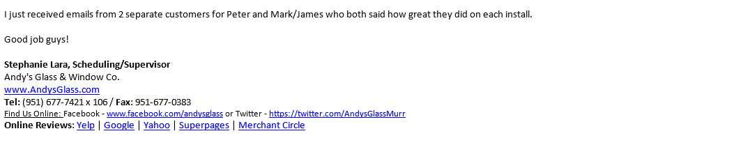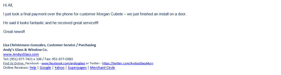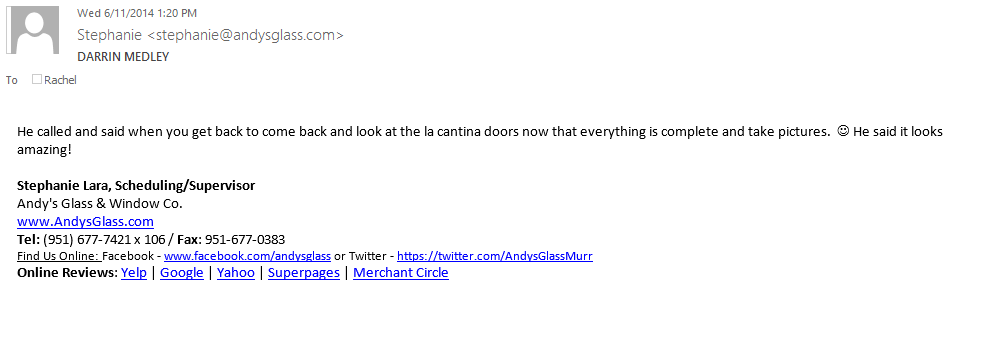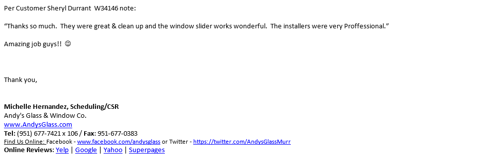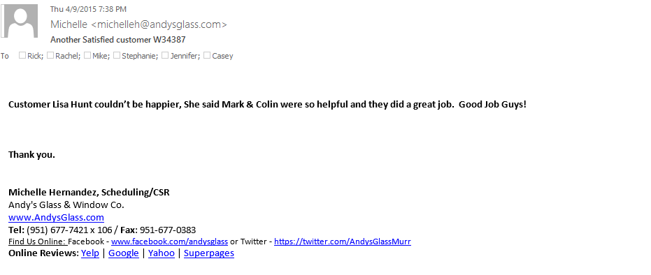 "Hi Rachel, Easy, reliable service. Never have to come out to redo a job. It's always done right the first time. We really enjoy doing business with Andy's Glass."