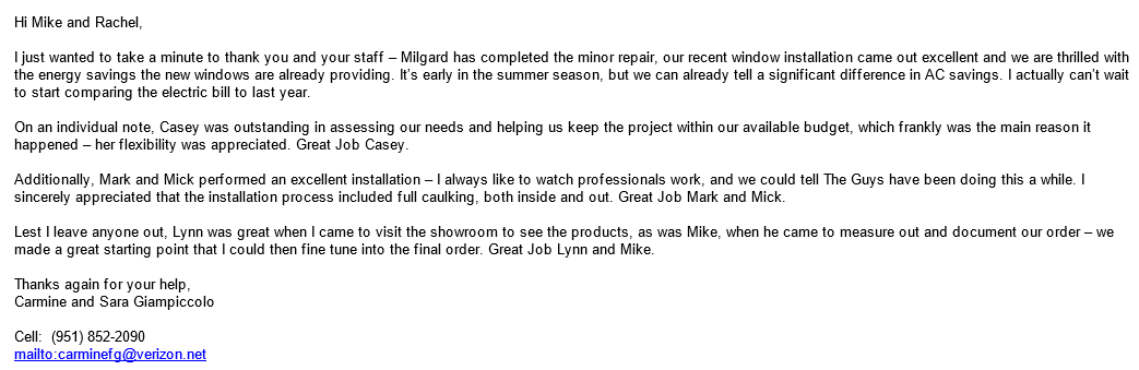 "Mike, Kay and I would like to comment on our recent window installation at 731 Buick Avenue, San Jacinto, CA. Your installers, Ralph and Erick were professional and pleasant. They arrived on time and were sensitive to our request that they be careful while working over our shrubs and sprinklers. Ralph and Erick were a real team. They installed four windows quickly and with attention to detail. The Milgard Tuscany windows, inside and out, look great!!! Ralph and Erick cleaned up spotlessly. They're two great employees, I'm sure. After the installation, Ralph demonstrated to us how the windows function and directed my attention to a scratch inside one of the windows. First, I was shocked that an installer would voluntarily point out an imperfection. Moreover, Ralph explained the Milgard warrantee and said ( he ) will inform his office. WOW! Now that's service. We did receive a call and an appointment to have the window replaced. In short, we are very pleased with our new windows. We look forward to a continued relationship with Andy's Glass & Window Company for our future needs. We will certainly recommend your services to our friends and neighbors. Thank Ralph and Erick for us."