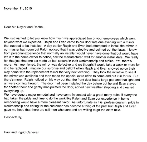 "I just wanted to send a quick note to thank you, and to tell you how impressed I am with your company. Quality workmanship on the sliding and french doors; mirrors; and the shower door and enclosure. There will usually be snags in any project, however you and your crew handled them with professionalism and courtesy and provided us quality workmanship and beauty in the products. Please thank your crew, from the office staff, to the line workers, for all their help."