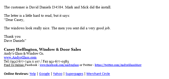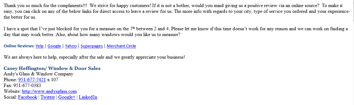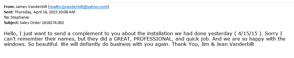 "Hi Jane, Thank you for taking care of scheduling the window replacement. We truly appreciate the professional and expedient service."