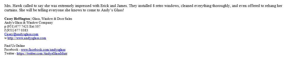 "Blake and Mike G. did a great job yesterday installing retro windows and a door in our home. We are thrilled with the windows and door and very impressed with the "professionalism and thoroughness" of your workers. We are impressed with the customer service and "team work" of Andy's Glass. We will definitely recommend Andy's Glass to our friends."